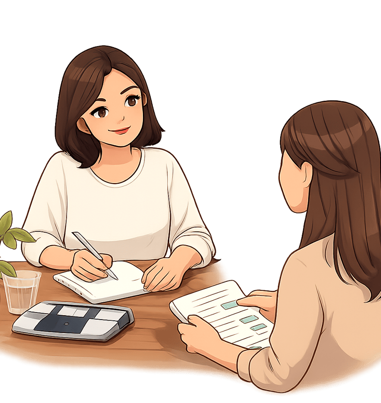 Primera fase de conexión: historia personal, relación con la comida, hábitos, emociones, contexto hormonal, medicación, creencias. Aquí escucho y observo sin juicio, y defines objetivos realistas y propios, no impuestos.